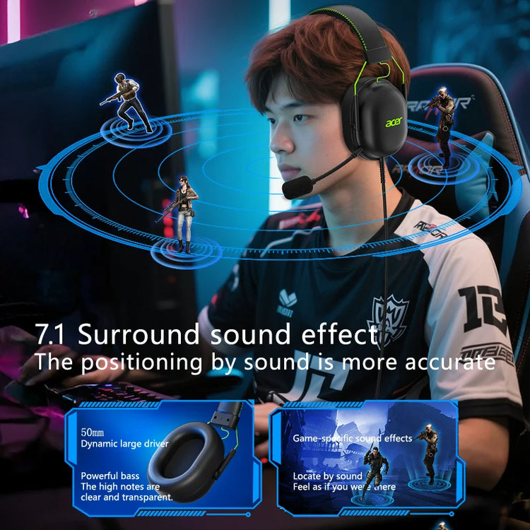 Auriculares Acer OHW200 2025 con sonido envolvente 7.1, cable USB, micrófono y cancelación de ruido para PC y portátiles.