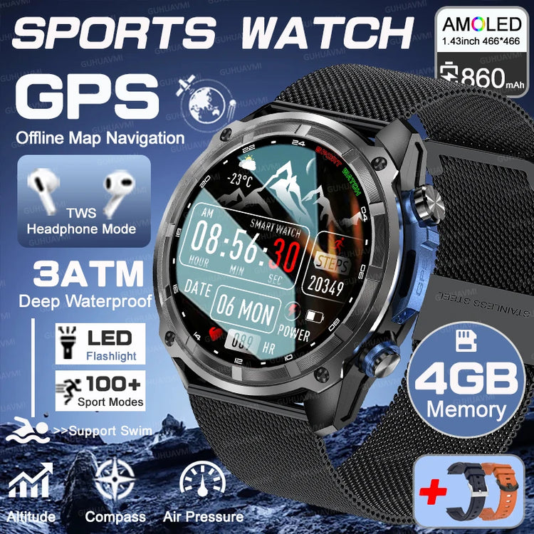Reloj inteligente táctico T-Rex 2025, GPS integrado, mapa sin conexión, TWS, 4 GB de memoria, IP69K, resistente al agua, para natación, para hombre, pulsera inteligente militar